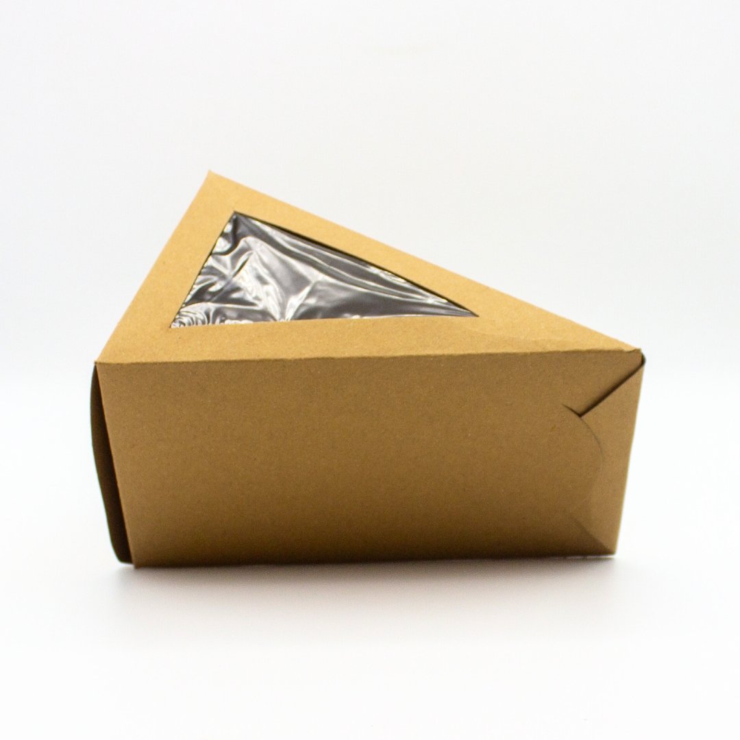 This Cake Slice box with a clear window is designed for secure and stylish packaging of sandwiches. The triangular shape ensures a snug fit for Cake, sandwiches, while the transparent window allows customers to see the product inside. Perfect for cafes, takeaway services, and online food businesses in Pakistan, this eco-friendly box is made from recyclable kraft paper, making it a sustainable choice for packaging.